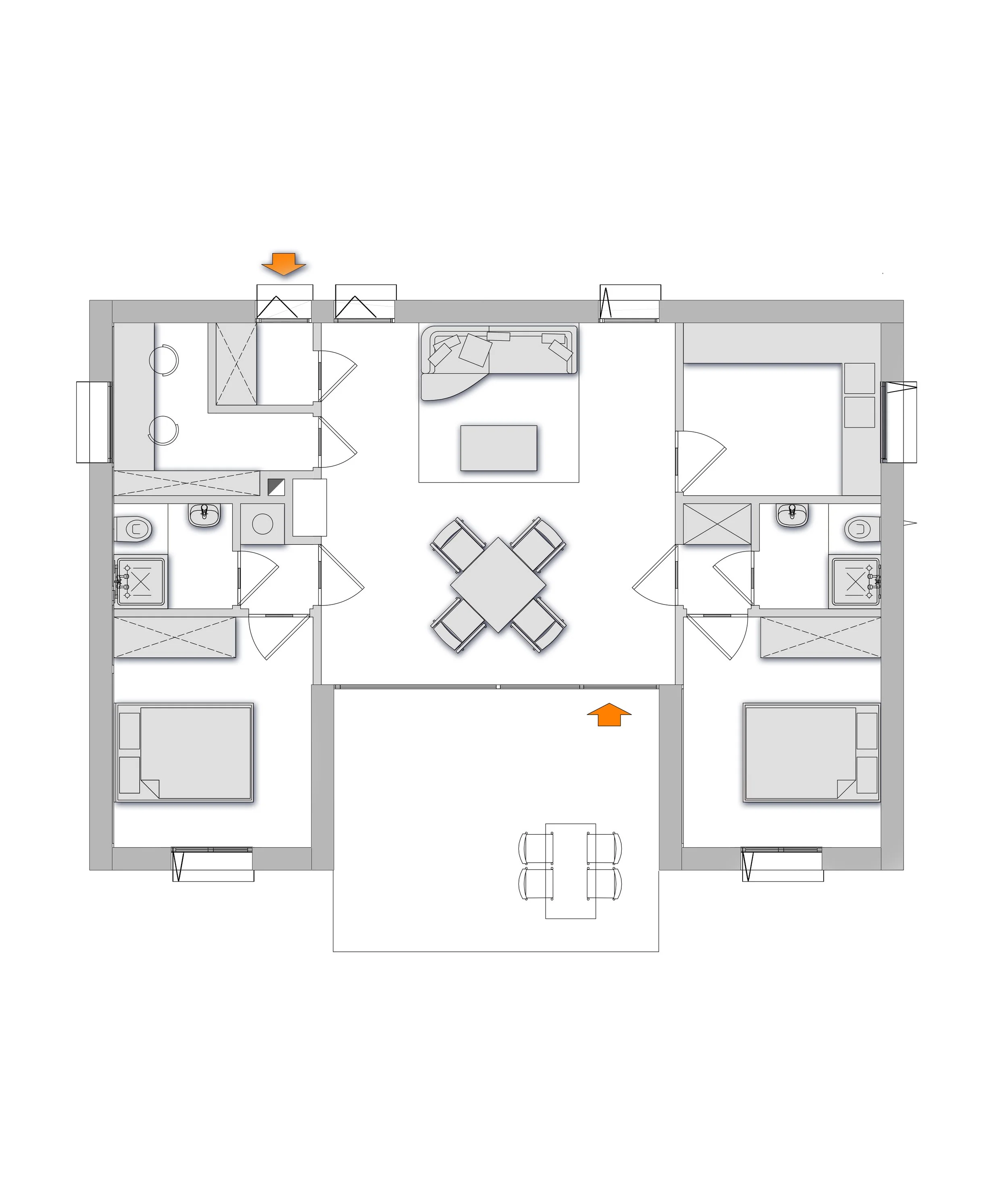 Планирана е да предостави удобно и рационално обитаване за 2-4 човека. С рационално разпределени площи, стегнатата плановата схема предвижда покрит чардак, салон с функциите на трапезария и дневна, кухня с килер за складиране, две спални, баня, дрешник и WC.