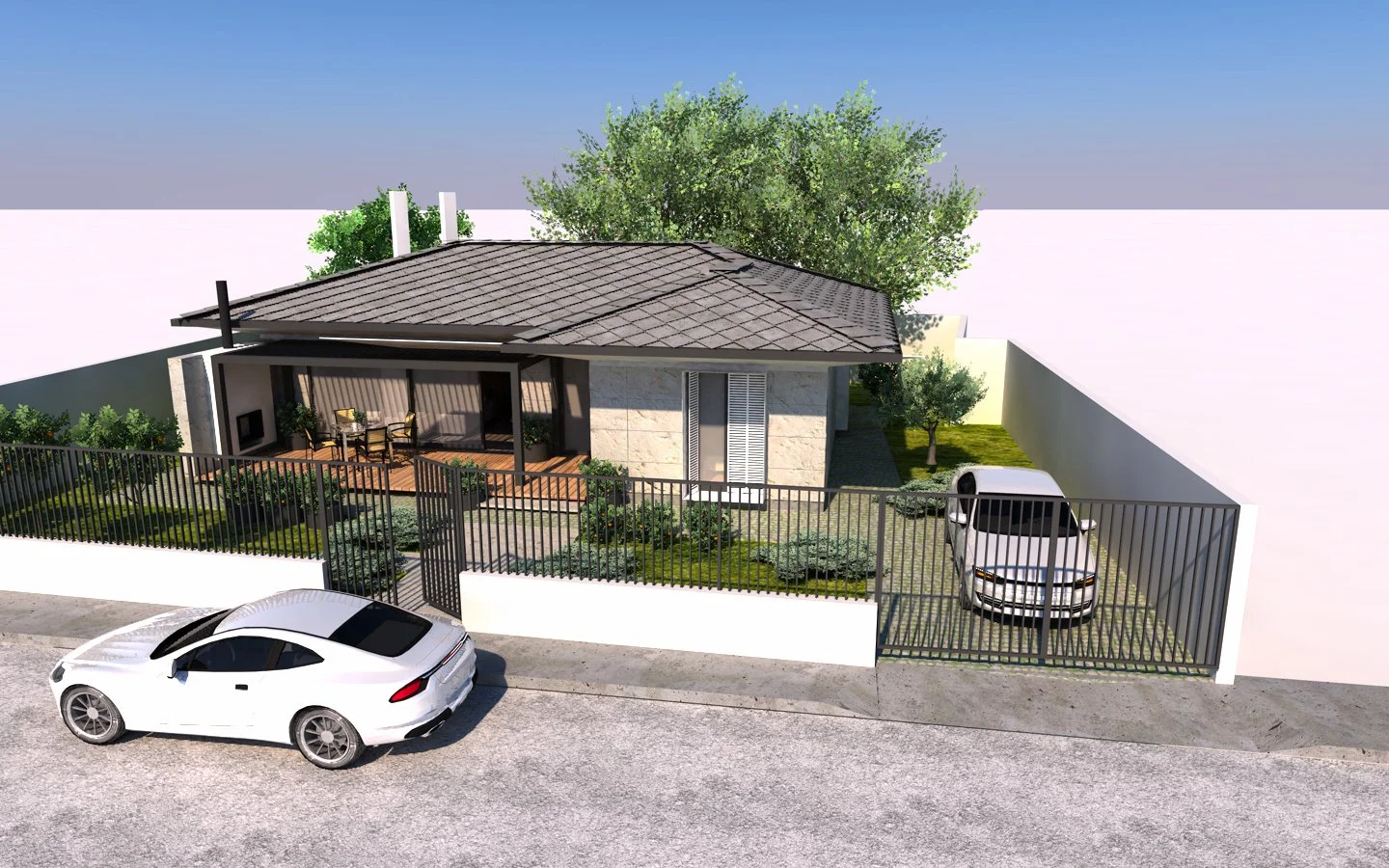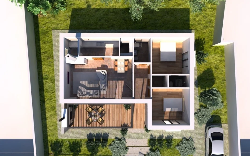 Къщата е свободностояща, едноетажна, с обширен чардак, който служи и за достъп до къщата. С рационално разпределени площи, стегнатата планова схема предвижда салон с функциите на трапезария и дневна, кухня с плъзгащи се врати, която по желание на обитателите се отваря или затваря към дневната, кухненски килер, входно пространство с дрешник за връхни дрехи и директен достъп до баня/WC, помещение с пералня и сушилня в съседство с кухнята с директен достъп към двора; две спални с южно и източно изложение, едната от които със собствена баня.