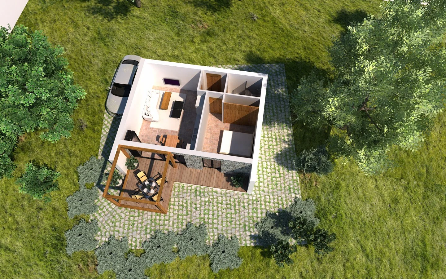 Уютна през зимата, отворена към двора през лятото, тази къща предлага най-високи нива на комфорт. Топлинната изолираност и вниманието към всеки детайл са на нивото на най-усъвършенстваните сгради от този тип – пасивни, нискоенергийни и нулевоенергийни къщи.