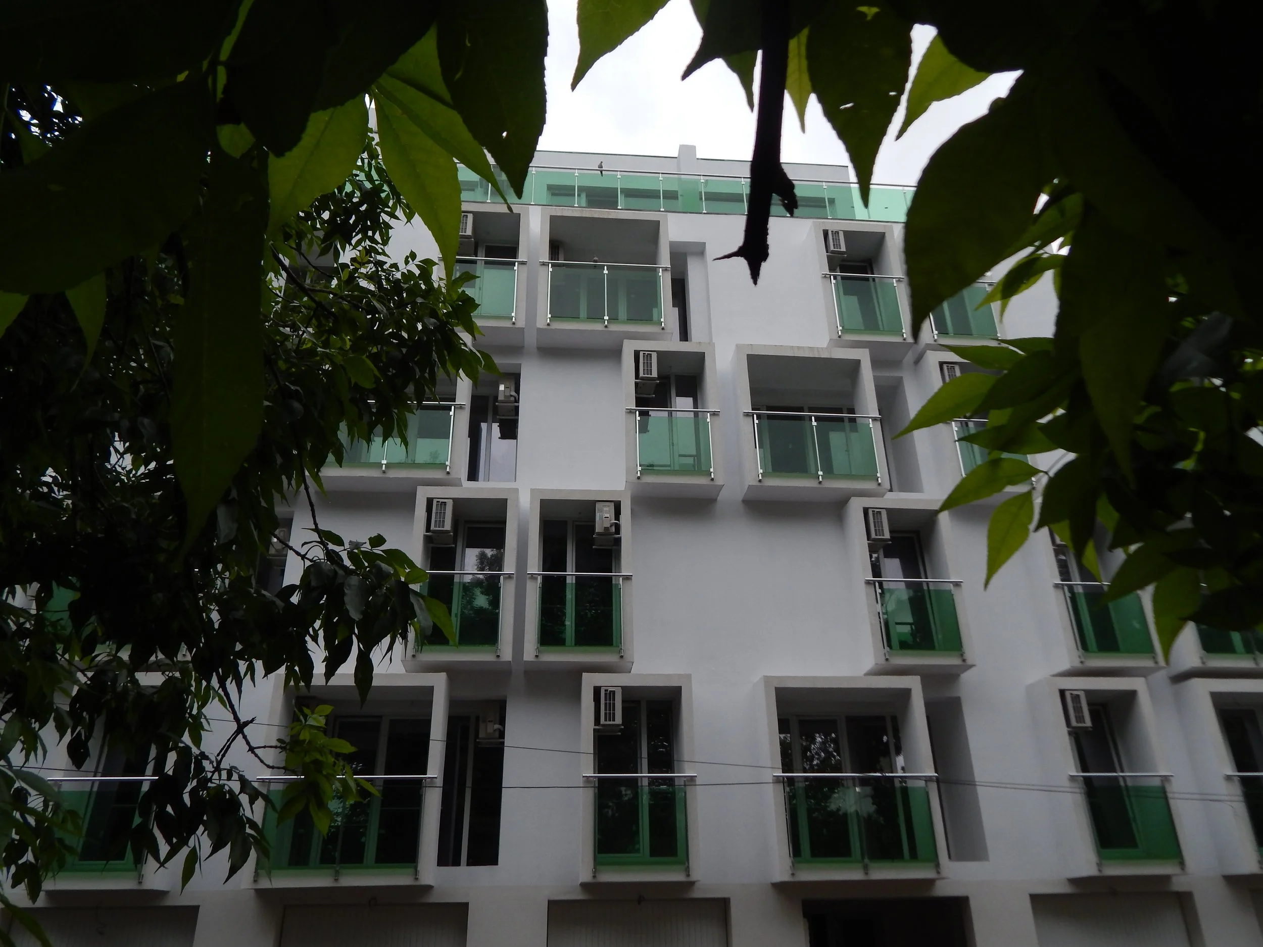 Елегантната бяла фасада и оформлението на балконите обрамчени в тънки бели кутии допринасят към по-благоприятен градски силует и среда.